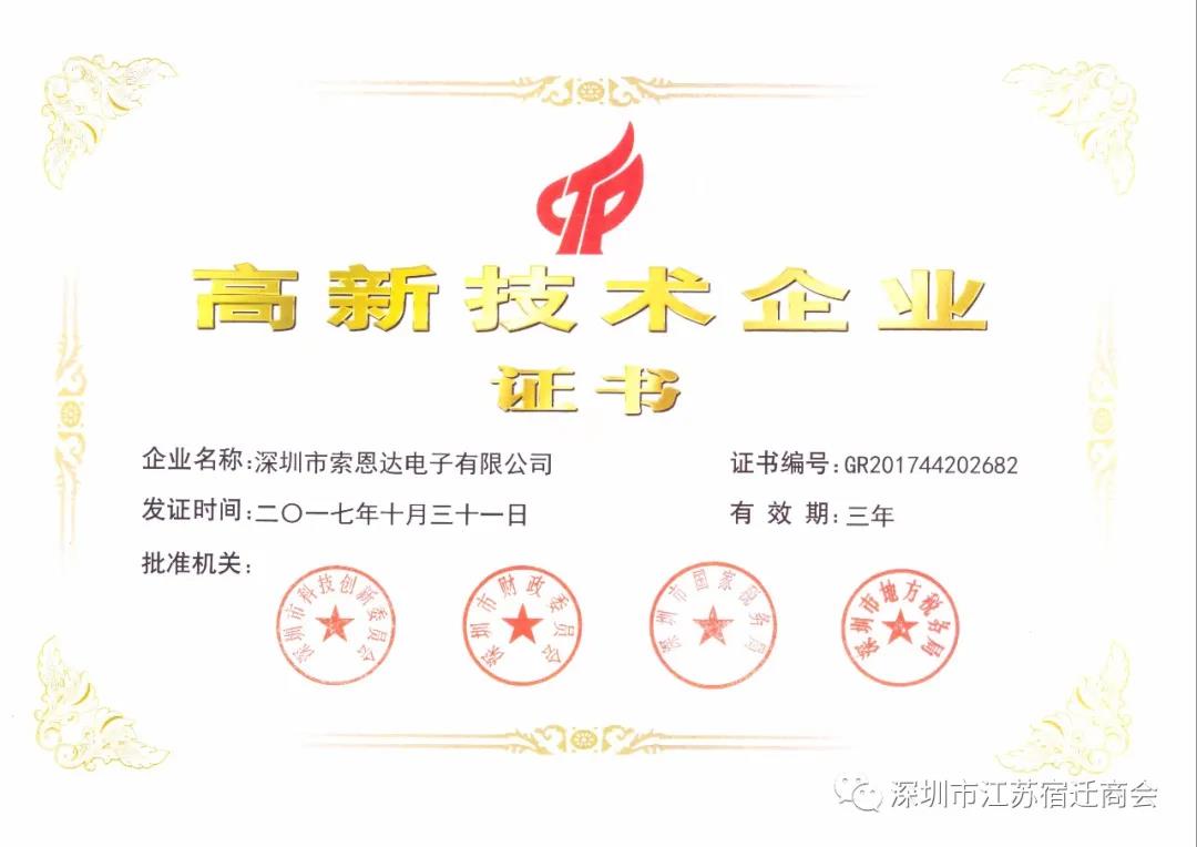 深圳市索恩达电子有限公司,为国家高新技术企业。2013年8月该企业成立于深圳国家软件产业园、2014年摩尔技术研发成功并获多项专利、2016年获得ISO09000认证、2016年10月钢网信息管理系统SIMS研发成功、2017年10月获得国家高新技术企业认证、2018年4月获得SMT CHINA唯一钢网检测管理系统全球VA远见奖、2018年6月建立钢网DFM标准化管理中心并成功打造行业数据标准化应用、2019年4月获得SMT CHINA钢网标准化解决方案全球VA远见奖。